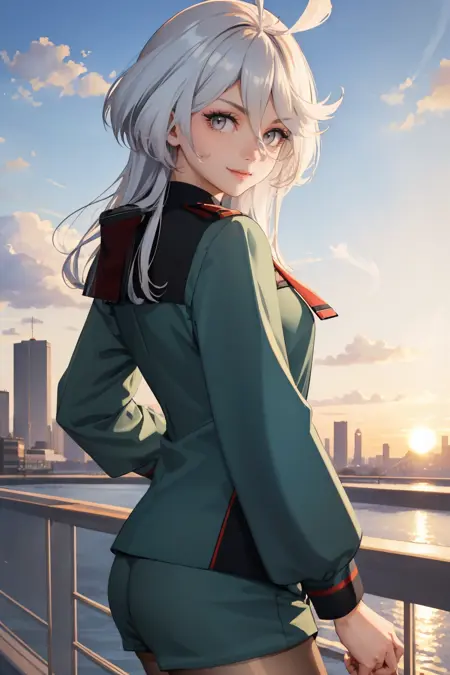 通常の姿には、「long hair, defmiorine, green jacket, red necktie, green shorts, pantyhose」を追加してください。