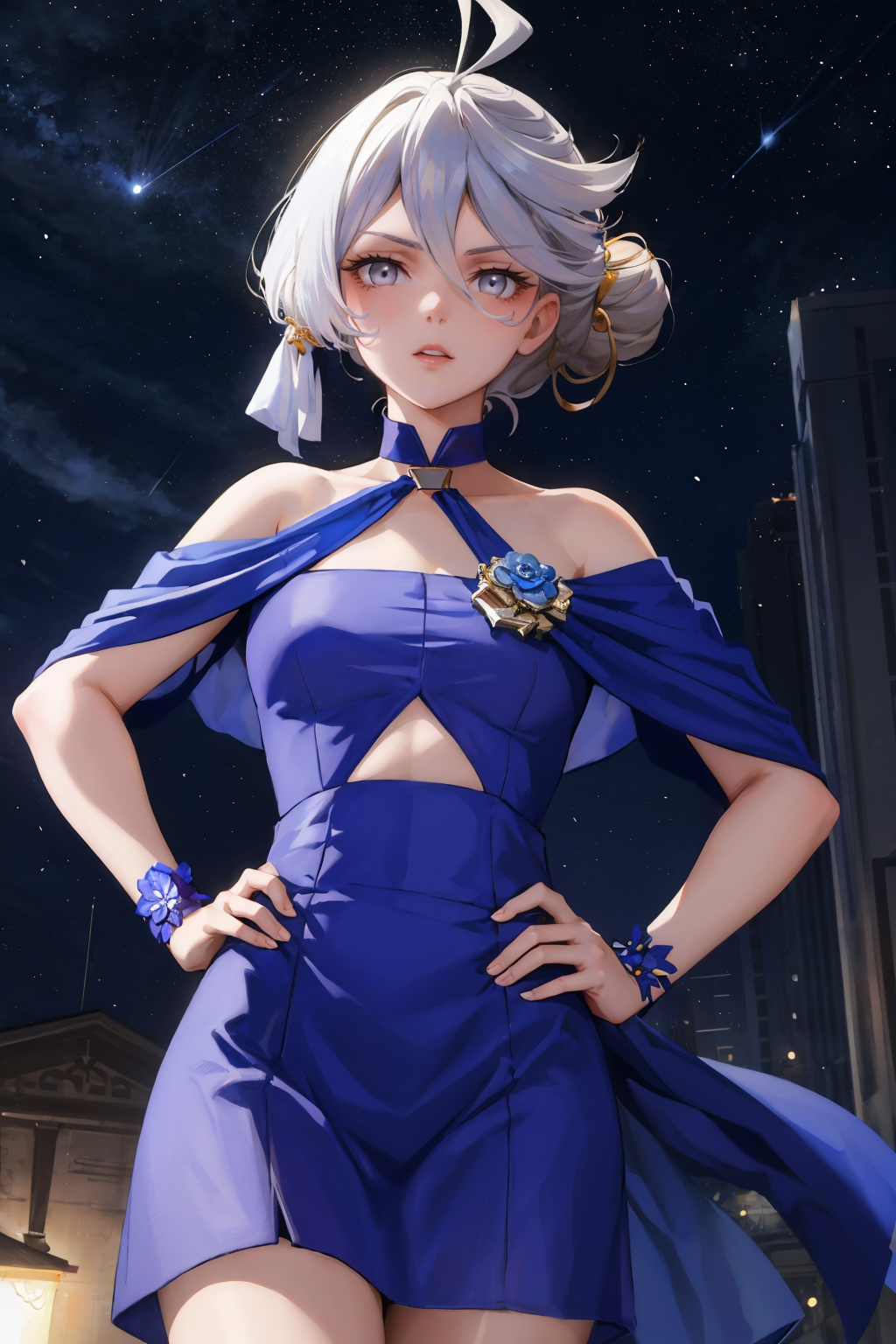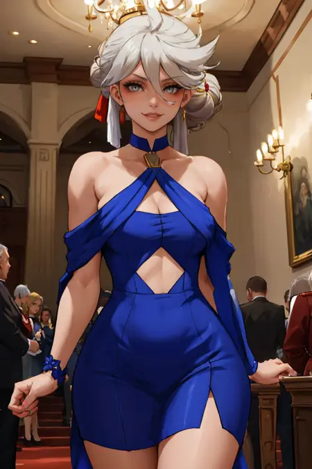 青いドレスには、「hair bun, dressmiorine, detached collar, halterneck, criss-cross halter, blue dress」を追加してください。