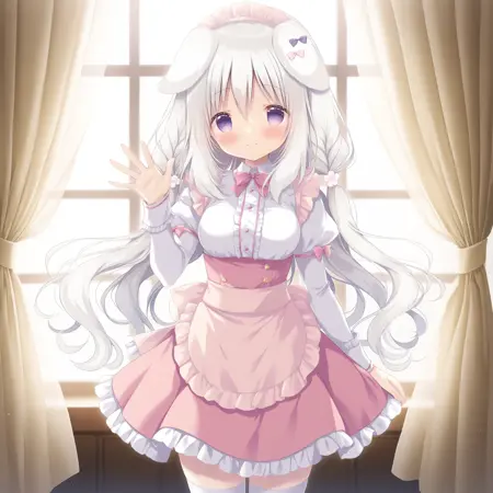 braid,puffy sleeves,long sleeves,white shirt,white thighhighs,frills,frilled apron,juliet sleeves,pink skirt,waist apron,frilled skirt,white apron,pink bow,center frills,maid headdress,hair bow,puffy short sleeves,collared shirt,