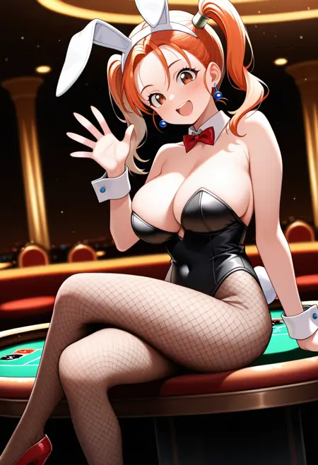 silver hair ornaments, white bunny headband, blue earrings, detached collar, red bowtie, cleavage, black bunnysuit, strapless, sleeveless, bare shoulders, wrist cuffs, fishnet pantyhose, bunny tail, red high heels,