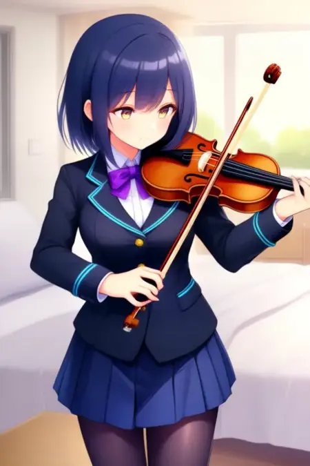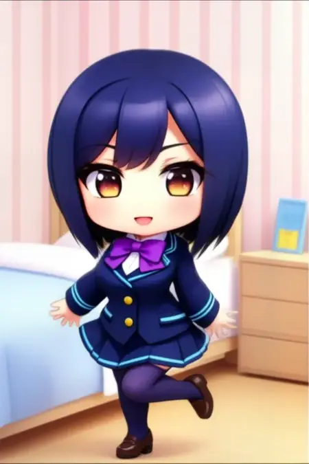 샘플 프롬프트: Shizuka Rin, anime-style girl. The image features an anime-style character with dark blue hair styled in a straight manner. The character has large, expressive eyes with a light brown color. They are wearing a school uniform consisting of a navy blue jacket with light blue trim, a white shirt, and a purple bow tie. The blazer has two gold buttons on the front and a pocket on each side. The character is also wearing a navy blue pleated skirt and matching thigh-high socks, (she is dancing:2.5), (chibi Nendoroid:3.5) in bedroom.