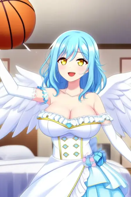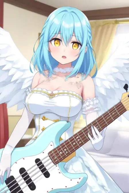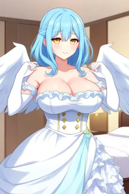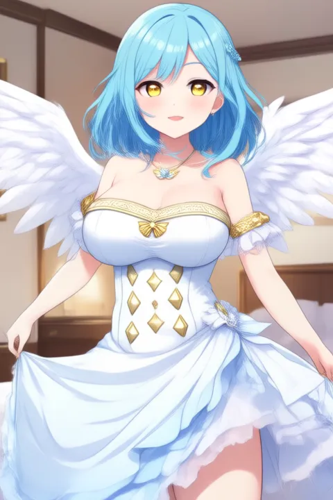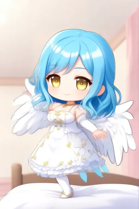 샘플 프롬프트: Moira, 애니메이션 스타일의 소녀. 이미지는 연한 파란색 머리카락을 느슨한 물결무늬로 스타일링한 애니메이션 스타일의 캐릭터를 특징으로 합니다. 캐릭터는 노란색 눈을 가지고 있으며, 금색 장식이 있는 흰색 드레스를 입고 있습니다. 드레스는 주름진 칼라와 다이아몬드 모양 패턴이 있는 몸에 맞는 상의를 가지고 있습니다. 캐릭터는 등에 달린 큰 흰색 깃털 날개를 가지고 있으며, 날개는 펼쳐져 있습니다. (그녀는 춤추고 있음:2.5), (치비 넌도로이드:3.5) 침실에서.