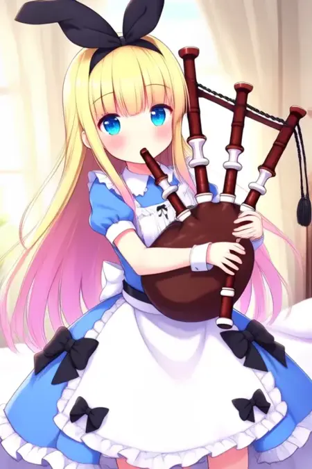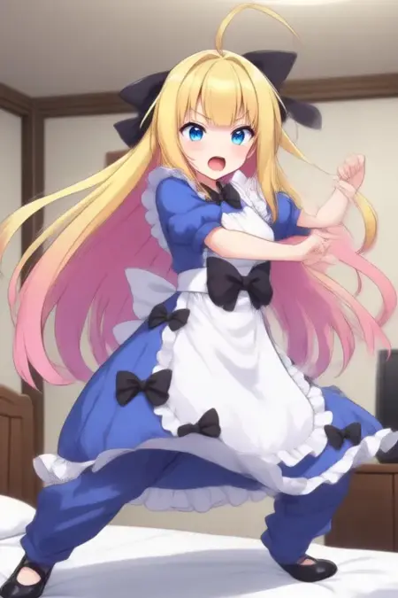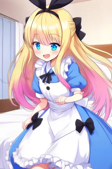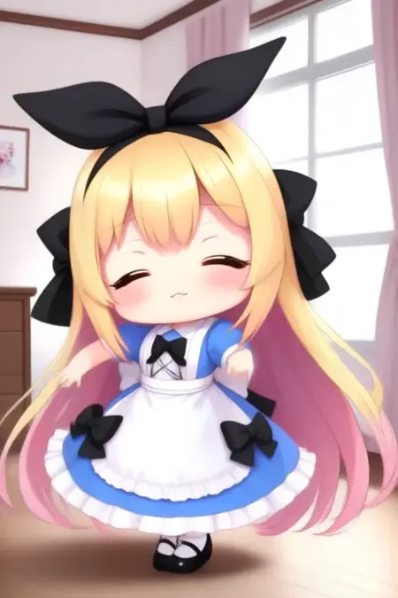 示例提示:Mononobe Alice,动漫风格女孩。图像呈现一位动漫风格的角色,拥有长而飘逸的头发,发色从前部的金色渐变至后部的粉红色,头部两侧各有一个大型黑色蝴蝶结。角色拥有大而富有表现力的蓝色眼睛,身穿一件饰有黑色蝴蝶结的白色连衣裙。裙子配有蓝色领口和袖子,并搭配一条系在腰间的白色围裙,腰部亦有黑色蝴蝶结装饰。(她正在跳舞:2.5),(Q版Nendoroid:3.5)在卧室中。