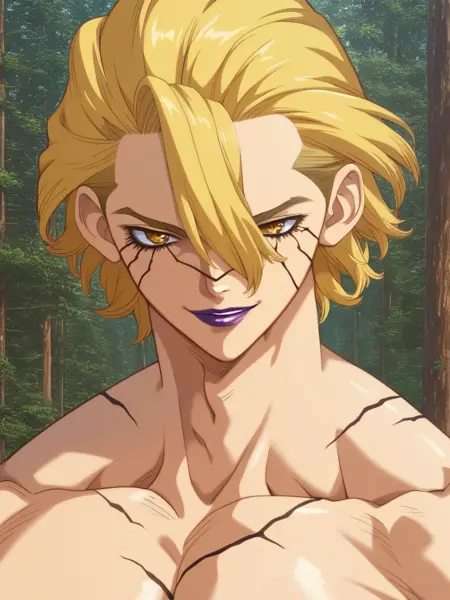 score_9, score_8_up, score_7_up, 来源:动漫,动漫,杰作,最佳品质,惊人品质,1个男孩,疤痕,黄发,黄眼,(极其详细,美丽的面部细节,杰作,最佳品质),彩绘嘴唇,紫色嘴唇,上半身,微笑,男性焦点,森林,单独,lora:Stanley_Snyder_-_Dr.Stone:1