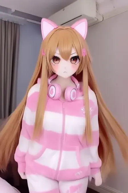 트리거 단어: Ienaga Mugi, 애니메이션 스타일 소녀. 이미지는 어깨를 넘어 길게 뻗은 곧고 연한 갈색 머리카락을 가진 애니메이션 스타일 캐릭터를 특징으로 합니다. 그녀는 큰 표현력 있는 눈을 가지고 있으며, 볼에 약간의 빨간빛이 도는 모습으로 당황하거나 수줍어하는 듯한 느낌을 줍니다. 그녀는 흰색과 분홍색 줄무늬가 있는 후드티를 입었으며, 후드는 위로 올라가 있고, 다리 왼쪽에 작은 무늬가 있는 같은 색상의 분홍색 바지를 착용하고 있습니다. 후드티는 앞쪽 주머니와 허리에 끈이 달려 있습니다. 그녀의 목에는 이어피스에 고양이 귀가 달린 분홍색 헤드폰을 착용하고 있으며, 헤드폰에는 작은 분홍색 발바닥 문양이 있습니다.