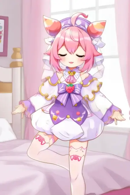 示例提示词:Ushimi Ichigo,动漫风格女孩。画面中的角色为动漫风格,粉色头发扎成双马尾,拥有大而富有表现力的眼睛,眼色融合了蓝色与粉色。她穿着一套充满幻想风格的服装,包括一件白色与紫色相间的连衣裙,裙身带有荷叶边装饰和金色纽扣,腰部系有蝴蝶结,胸前点缀着一颗小草莓。裙子较短,裙摆呈荷叶边设计,同时还穿着过膝长筒袜,袜子上布满细小的心形和圆点图案。(她正在跳舞:2.5),(Q版Nendoroid:3.5)在卧室中。