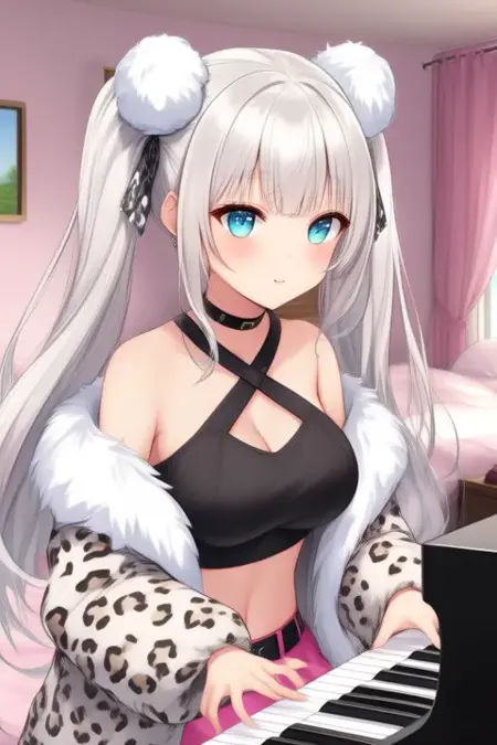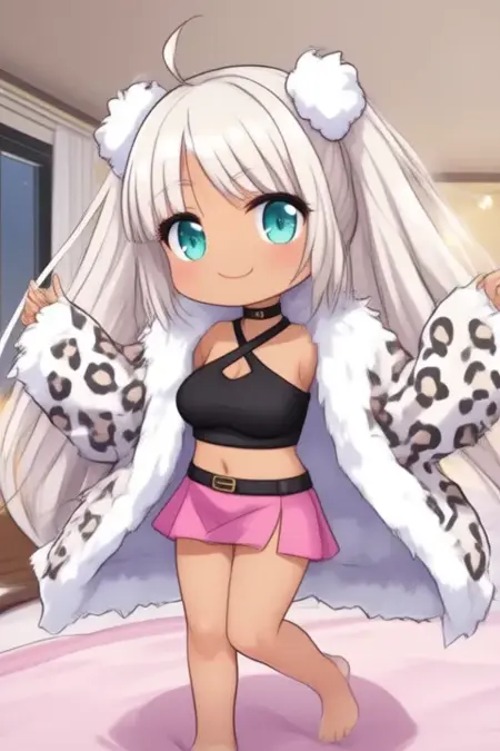 sample prompt:Todoroki Kyoko, anime-style girl. The image features an anime-style character with long, flowing white hair styled in twin tails with fluffy white puffs at the ends. The character has light blue eyes and is wearing a black top with thin straps and a choker around the neck. The outfit includes a white fur-like garment that covers most of the body, giving it a fluffy appearance, leopard-printed coat. and a pink skirt with a black belt, (she is dancing:2.5), (chibi Nendoroid:3.5) in bedroom.