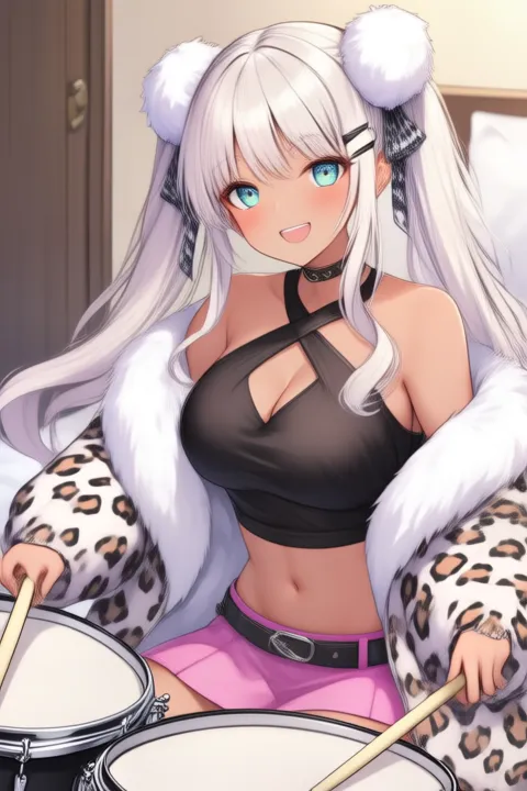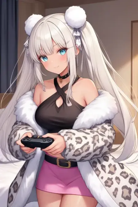 Trigger Word:Todoroki Kyoko, anime-style girl. The image features an anime-style character with long, flowing white hair styled in twin tails with fluffy white puffs at the ends. The character has light blue eyes and is wearing a black top with thin straps and a choker around the neck. The outfit includes a white fur-like garment that covers most of the body, giving it a fluffy appearance, leopard-printed coat. and a pink skirt with a black belt,