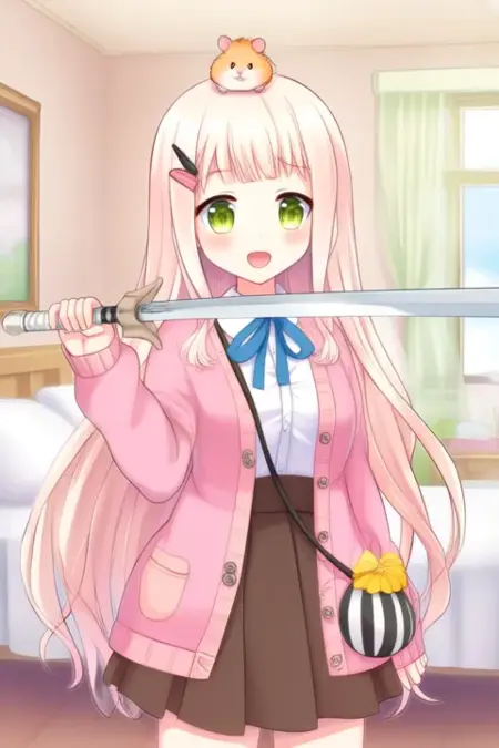 トリガーワード:Machita Chima、アニメスタイルの少女。画像には、肩より長い薄ピンク色の髪をもつアニメスタイルのキャラクターが描かれています。髪はゆるやかなウェーブスタイルで、柔らかく流れるような外観をしています。頭頂部にはかわいらしい小さなハムスターが乗っており、ヘアスタイルに細部を加えています。キャラクターは、無邪気さと好奇心を表す大きな表情豊かな緑色の目を持っています。目は大きく開いており、口は少し開いていて、微笑みや驚きの表情を示しています。キャラクターは、襟に青いネクタイを結んだ白いシャツを着ており、衣装に彩りを加えています。シャツの上には、いくつかのボタンがついたピンクのカーディガンを着ており、快適でカジュアルな雰囲気を醸し出しています。カーディガンの前面にはいくつかのポケットがあり、その一つには小さな円形の縞模様のポーチが飾られており、黄色い花が描かれています。キャラクターはまた、膝の少し上まで届く茶色のスカートを履いています。スカートは前面にいくつかのボタンが並んだシンプルなデザインです。