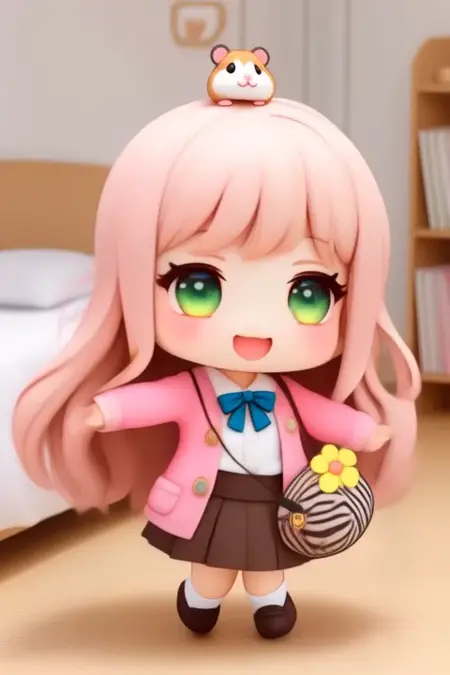 샘플 프롬프트: Machita Chima, anime-style girl. The image features an anime-style character with long, light pink hair that flows down past the shoulders. The hair is styled in loose waves, giving it a soft and flowing appearance. There is a cute small hamster on the top of the head, adding a touch of detail to the hairstyle. The character has large, expressive green eyes that convey a sense of innocence and curiosity. The eyes are wide open, and the character's mouth is slightly open, suggesting a smile or a surprised expression. The character is wearing a white shirt with a blue bow tie at the collar, which adds a pop of color to the outfit. Over the shirt, there is a pink cardigan with a few buttons, giving it a cozy and casual look. The cardigan has a few pockets on the front, one of which is adorned with a small, round, striped pouch decorated with a yellow flower. The character is also wearing a brown skirt that reaches just above the knees. The skirt has a simple design with a few buttons down the front. (she is dancing:2.5), (chibi Nendoroid:3.5) in bedroom.