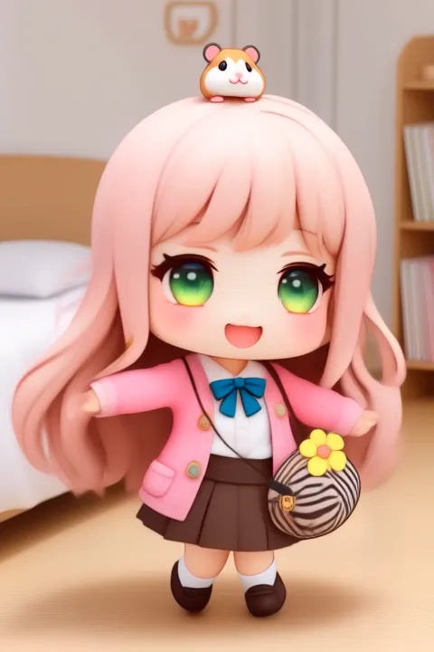 サンプルプロンプト:Machita Chima、アニメスタイルの少女。画像には、肩より長い薄ピンク色の髪をもつアニメスタイルのキャラクターが描かれています。髪はゆるやかなウェーブスタイルで、柔らかく流れるような外観をしています。頭頂部にはかわいらしい小さなハムスターが乗っており、ヘアスタイルに細部を加えています。キャラクターは、無邪気さと好奇心を表す大きな表情豊かな緑色の目を持っています。目は大きく開いており、口は少し開いていて、微笑みや驚きの表情を示しています。キャラクターは、襟に青いネクタイを結んだ白いシャツを着ており、衣装に彩りを加えています。シャツの上には、いくつかのボタンがついたピンクのカーディガンを着ており、快適でカジュアルな雰囲気を醸し出しています。カーディガンの前面にはいくつかのポケットがあり、その一つには小さな円形の縞模様のポーチが飾られており、黄色い花が描かれています。キャラクターはまた、膝の少し上まで届く茶色のスカートを履いています。スカートは前面にいくつかのボタンが並んだシンプルなデザインです。 (彼女は踊っている:2.5), (ちびネンドロイド:3.5)、寝室で。