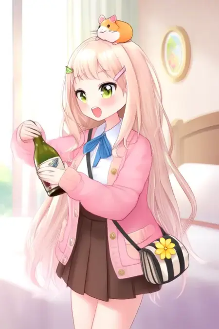 트리거 단어: Machita Chima, 애니메이션 스타일 소녀. 이미지는 어깨보다 길게 흐르는 긴 연분홍색 머리카락을 가진 애니메이션 스타일 캐릭터를 특징으로 합니다. 머리는 느슨한 물결무늬로 스타일링되어 부드럽고 유동적인 외관을 줍니다. 머리 꼭대기에는 귀여운 작은 햄스터가 있어 헤어스타일에 세부적인 요소를 더합니다. 캐릭터는 순진함과 호기심을 전달하는 큰 표현력 있는 녹색 눈을 가지고 있습니다. 눈은 넓게 뜨여 있고, 입은 살짝 벌어져 미소나 놀란 표정을 나타냅니다. 캐릭터는 목에 파란색 리본 넥타이를 단 흰색 셔츠를 입고 있으며, 이는 옷에 색감을 더해 줍니다. 셔츠 위에는 몇 개의 단추가 달린 분홍색 카디건을 입고 있어 편안하고 캐주얼한 분위기를 줍니다. 카디건 앞면에는 몇 개의 주머니가 있으며, 그 중 하나는 노란 꽃이 장식된 작은 둥글고 줄무늬 패치로 꾸며져 있습니다. 캐릭터는 무릎 위까지 오는 갈색 스커트를 신고 있습니다. 스커트는 앞면에 몇 개의 단추가 있는 간단한 디자인입니다.