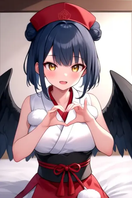 트리거 단어: Yamagami Karuta, 애니메이션 스타일 소녀. 이미지는 두 쪽 머리 옆에 두 개의 뾰족한 단발머리를 가진 어두운 파란색 머리카락을 가진 애니메이션 스타일 캐릭터를 특징으로 합니다. 그녀는 황금색 눈을 가지고 있으며, 흰색 상의에 빨간색 액센트와 빨간 치마로 구성된 전통적인 일본 복장을 입고 있습니다. 복장에는 허리에 매인 빨간 띠와 매칭되는 빨간 리본이 달린 빨간 모자가 포함되어 있습니다. 캐릭터는 목에 흰색 털처럼 보이는 장식을 가지고 있으며, 등 뒤에서 커다란 검은 날개가 뻗어 있습니다.