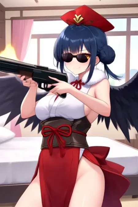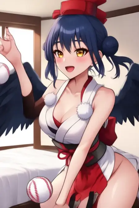 샘플 프롬프트: Yamagami Karuta, 애니메이션 스타일 소녀. 이미지는 두 쪽 머리 옆에 두 개의 뾰족한 단발머리를 가진 어두운 파란색 머리카락을 가진 애니메이션 스타일 캐릭터를 특징으로 합니다. 그녀는 황금색 눈을 가지고 있으며, 흰색 상의에 빨간색 액센트와 빨간 치마로 구성된 전통적인 일본 복장을 입고 있습니다. 복장에는 허리에 매인 빨간 띠와 매칭되는 빨간 리본이 달린 빨간 모자가 포함되어 있습니다. 캐릭터는 목에 흰색 털처럼 보이는 장식을 가지고 있으며, 등 뒤에서 커다란 검은 날개가 뻗어 있습니다. (그녀는 춤추고 있음:2.5), (치비 넌도로이드:3.5) 침실에서.