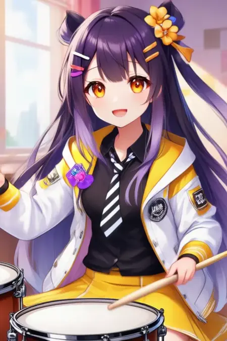 示例提示:Umise Yotsuha,动漫风格女孩。图像展现了一位动漫风格的角色,拥有长而深紫色的双马尾发型,大而富有表现力的橙色眼睛。她穿着一件白色和黄色的夹克,配有黑色细节,内搭黑色衬衫。夹克左侧有一个写着“ASTRO”的徽章,另一个徽章上标有数字“4”。她还佩戴一条条纹领带,外穿黑色背心,搭配黄色短裙。脖子上挂着一个小型紫色饰品,看起来像护身符或吊坠。(她正在跳舞:2.5),(Q版Nendoroid:3.5)在卧室中。