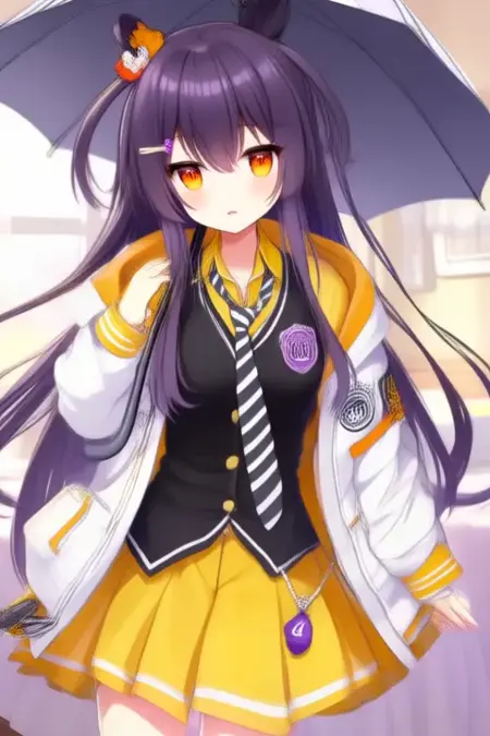 触发词:Umise Yotsuha,动漫风格女孩。图像展现了一位动漫风格的角色,拥有长而深紫色的双马尾发型,大而富有表现力的橙色眼睛。她穿着一件白色和黄色的夹克,配有黑色细节,内搭黑色衬衫。夹克左侧有一个写着“ASTRO”的徽章,另一个徽章上标有数字“4”。她还佩戴一条条纹领带,外穿黑色背心,搭配黄色短裙。脖子上挂着一个小型紫色饰品,看起来像护身符或吊坠。