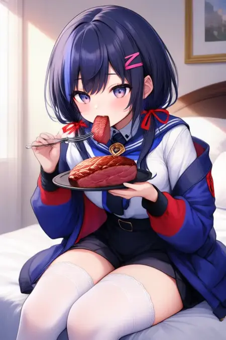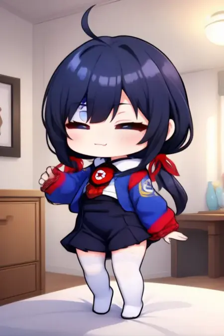sample prompt:Ponto Nei, anime-style girl. The image features an anime-style character with dark blue hair styled in low twintails, each adorned with a red ribbon bow. Their eyes are large and expressive, with a light blue or grayish hue. They are wearing a white shirt with a blue collar and a black vest over it. The vest has red accents on the shoulders and sleeves. They are dressed in a blue and red outfit that includes a jacket with a hood and gloves. The character is also wearing thigh-high white stockings, (she is dancing:2.5), (chibi Nendoroid:3.5) in bedroom.
