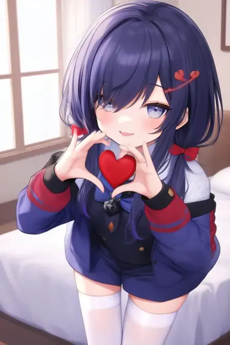Trigger Word:Ponto Nei, anime-style girl. The image features an anime-style character with dark blue hair styled in low twintails, each adorned with a red ribbon bow. Their eyes are large and expressive, with a light blue or grayish hue. They are wearing a white shirt with a blue collar and a black vest over it. The vest has red accents on the shoulders and sleeves. They are dressed in a blue and red outfit that includes a jacket with a hood and gloves. The character is also wearing thigh-high white stockings,