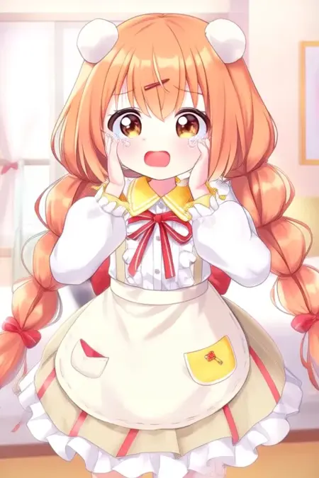 サンプルプロンプト: Kirara Tamako, anime-style girl。画像には、長いオレンジ色の髪をツインテールにスタイルされたアニメ風のキャラクターが描かれています。髪の上部には、小さな白いクマの耳が両側に付いています。キャラクターの目は大きく、表情豊かで茶色です。明るい笑顔をしています。キャラクターは、ふりふりの袖と黄色いカラーの白いブラウスを着ており、首元には赤いリボンが結ばれており、前面には小さなリボンがついています。服装には、側面に赤いストライプと左側に小さなポケットが付いた明るい色のスカートも含まれています。全体的な衣装は、遊び心がありかわいらしいスタイルで、学校の制服やコスチュームを彷彿とさせます。エプロンの左側にも小さなポケットがついています。彼女の服装には、ふりふりのハムをもつ白いスカートと黄色いベルトが含まれています。(she is dancing:2.5), (chibi Nendoroid:3.5) in bedroom。