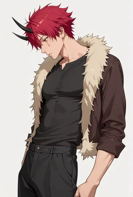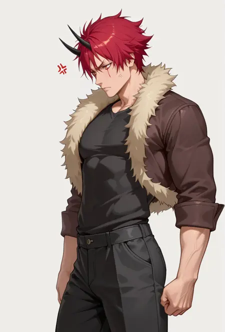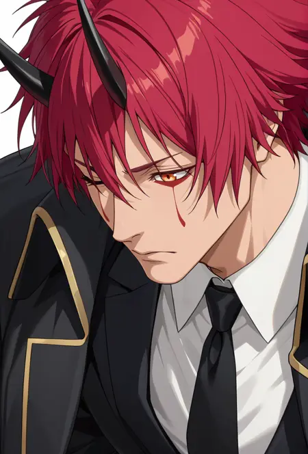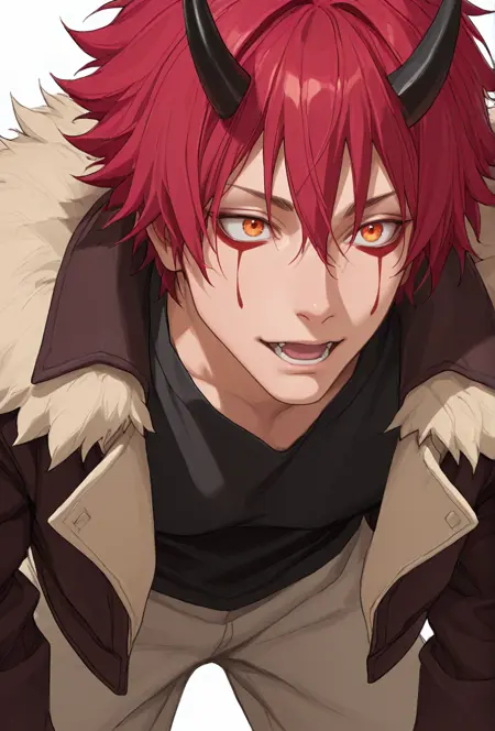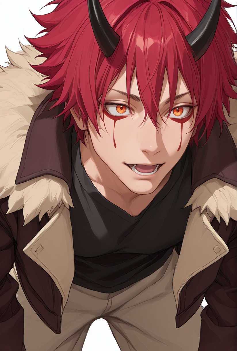 benimarucnn,1boy, red hair, short hair,orange eyes, facial mark, horns,