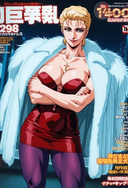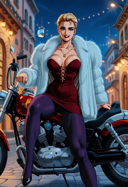 | 训练词汇 | LuciferAC, 1girl, solo, muscular female, muscular build, fair skin, blonde hair, short hair, slicked back hair, aqua eyes, eyelashes, lips, nose, red lipstick, collarbone, large breast, round breast, cleavage, red short dress, red corset, white fluffy fur coat, thick thighs, purple pantyhose, black shoes, necklace with golden cross, red nails, coat on shoulder, motorcycle, Harley Davidson bike,已复制! |