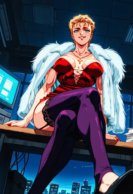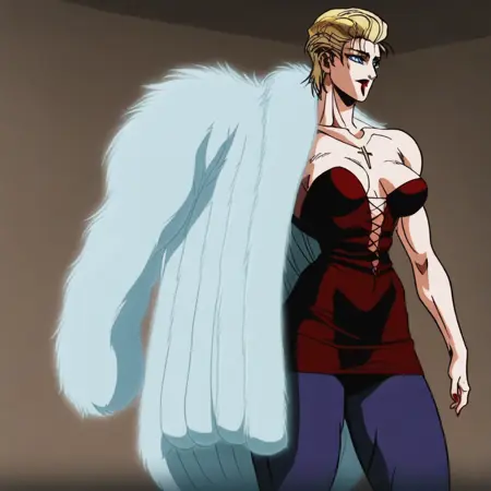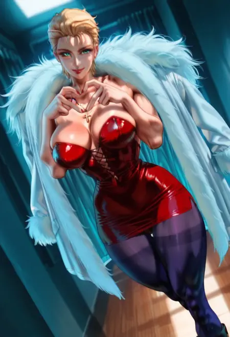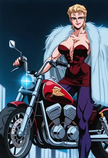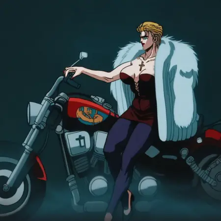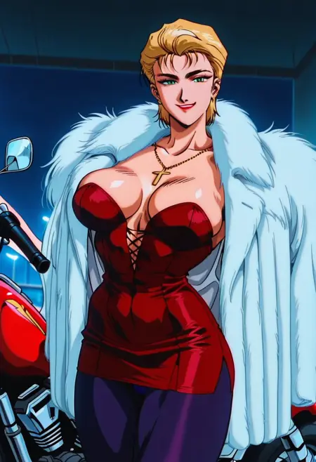 LuciferAC, 1girl, solo, muscular female, muscular build, fair skin, blonde hair, short hair, slicked back hair, aqua eyes, eyelashes, lips, nose, red lipstick, collarbone, large breast, round breast, cleavage, red short dress, red corset, white fluffy fur coat, thick thighs, purple pantyhose, black shoes, necklace with golden cross, red nails, coat on shoulder, motorcycle, Harley Davidson bike,