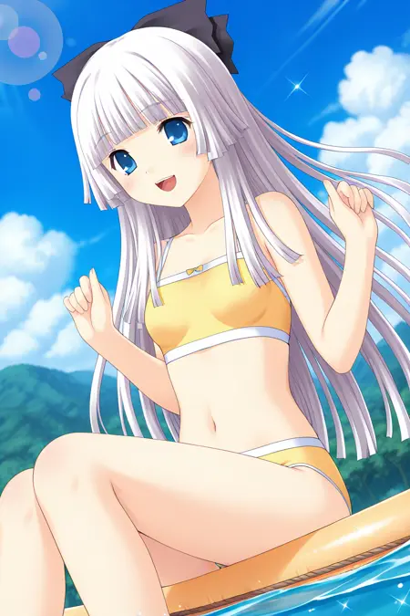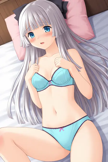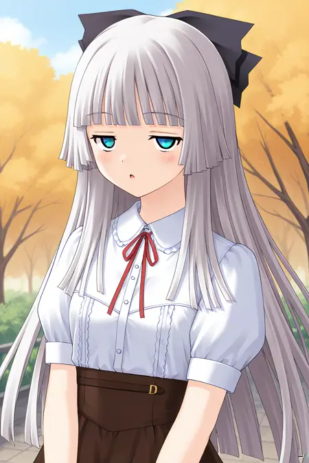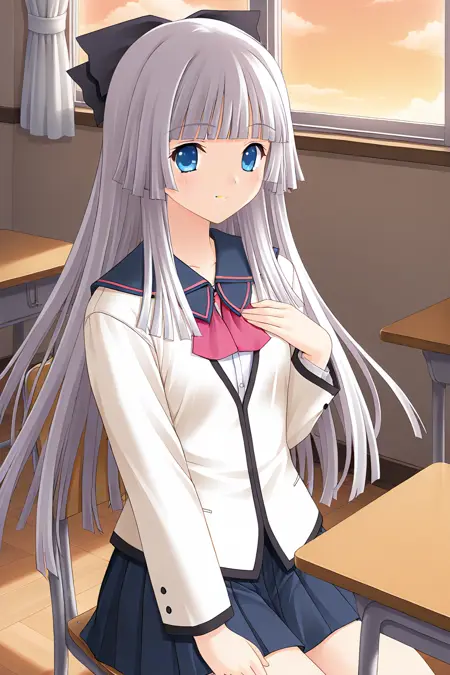 rokujou miyaho,blue eyes,grey hair,very long hair,blunt bangs,hime cut,straight hair,blunt ends,sidelocks,hair bow,black bow