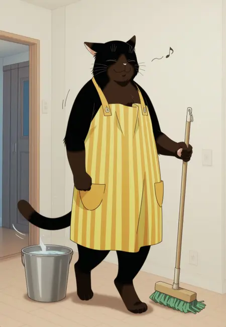 标签: 男性,兽人男性,家猫,猫科动物,黑猫,粉红色耳内,竖瞳,黑色瞳孔,黑色毛发,棕色毛发,粉红色鼻子,双色毛发,胡须,尾巴,条纹围裙,黄橙色围裙,无袖