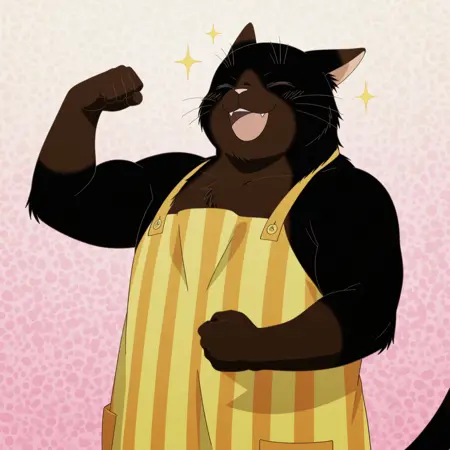 사용 태그: 남성, 페리 남성, 집고양이, 고양이, 검은 고양이, 분홍색 귀 안쪽, 좁은 동공, 검은 동공, 검은 털, 갈색 털, 분홍색 코, 이색 털, 수염, 꼬리, 줄무늬 에프론, 노랑과 주황 에프론, 어깨 없음