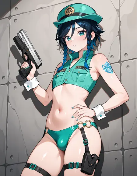 재현되는 주요 요소는 "경찰 모자, 경찰 스타일 수영복, 언더부브, O링 바텀, 허벅지 홀스터, 경찰 배지처럼 디자인된 팔 문신, 총을 들고 있는 것, 손목 커프스"입니다.