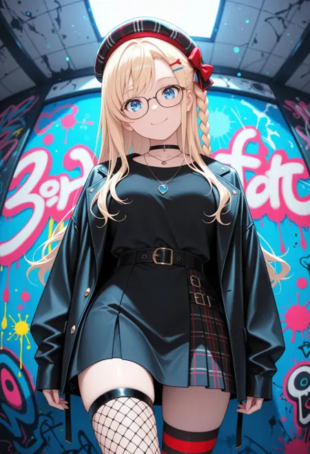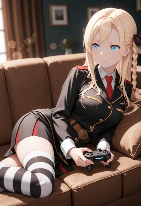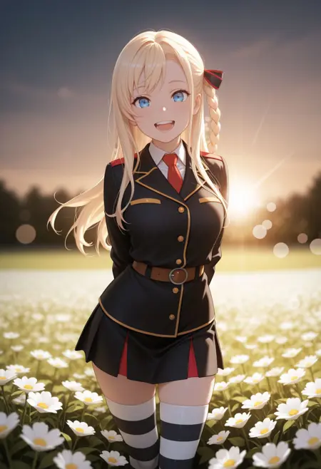 Trigger: 1girl, blonde hair, long hair, blue eyes, single braid, military uniform, red necktie, belt, black skirt, shirt, black jacket, striped clothes, striped thighhighs