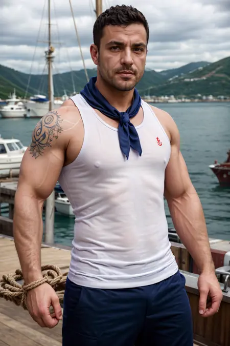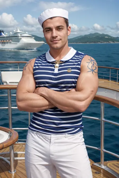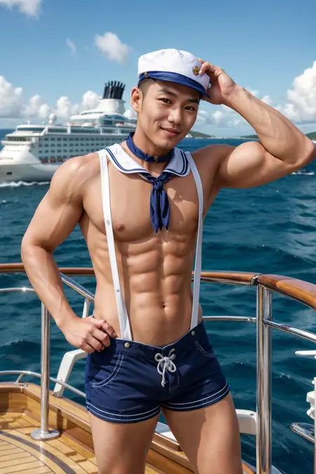 이것이 누군가의 제안이었는지 기억나지 않지만, 어쨌거나 저는 꼭 해보고 싶었던 내용입니다. 얇거나 세็ก시한 선원 복장을 입은 남성들의 사실적인 이미지로 학습되었습니다..