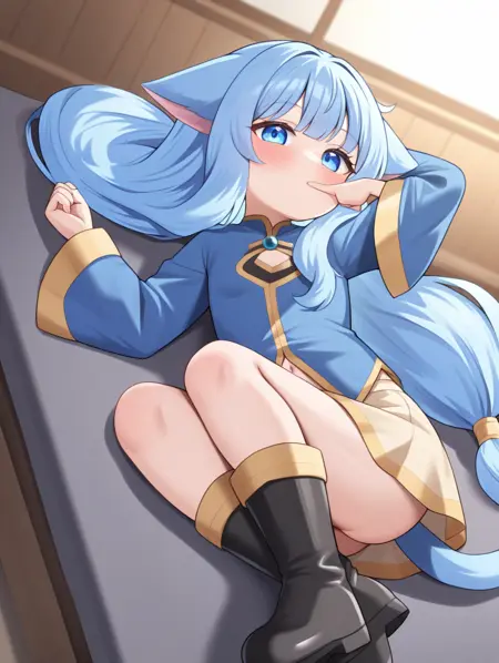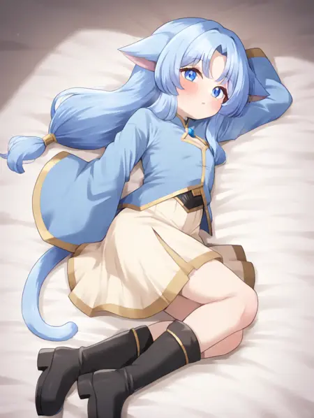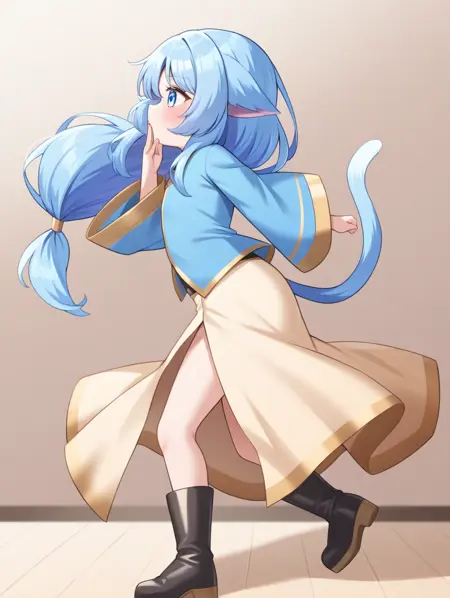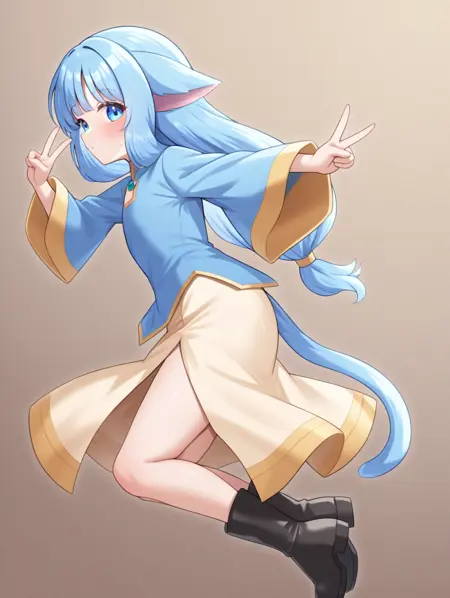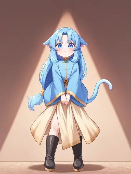提示词示例:renasu,蓝发,低扎长发,蓝发,动物耳朵,蓝色衬衫,长袖,宽袖,金边,长米色裙子,猫尾,前开叉,黑色靴子,裸耳,