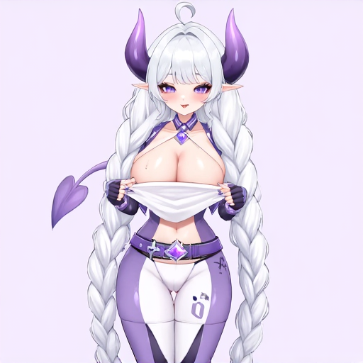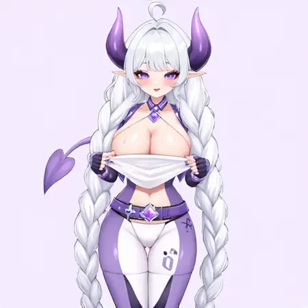 (VTuber_Powdur, demon girl, gradient horns, pointy ears, demon tail, purple eyes, purple horns, purple nails, demon horns, long hair, cleavage, white hair, very long hair, twin braids, purple chest jewel, criss-cross halter, ahoge, purple belt, white tube top, collarbone, white bodysuit, purple bodysuit, fingerless gloves, thigh gap, blush, double-parted bangs, white panties, eyelashes, lip piercing, hair intakes, huge ahoge, eyeshadow),