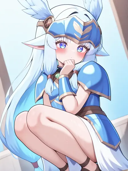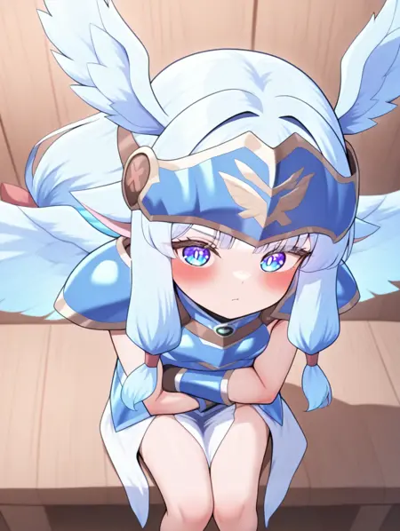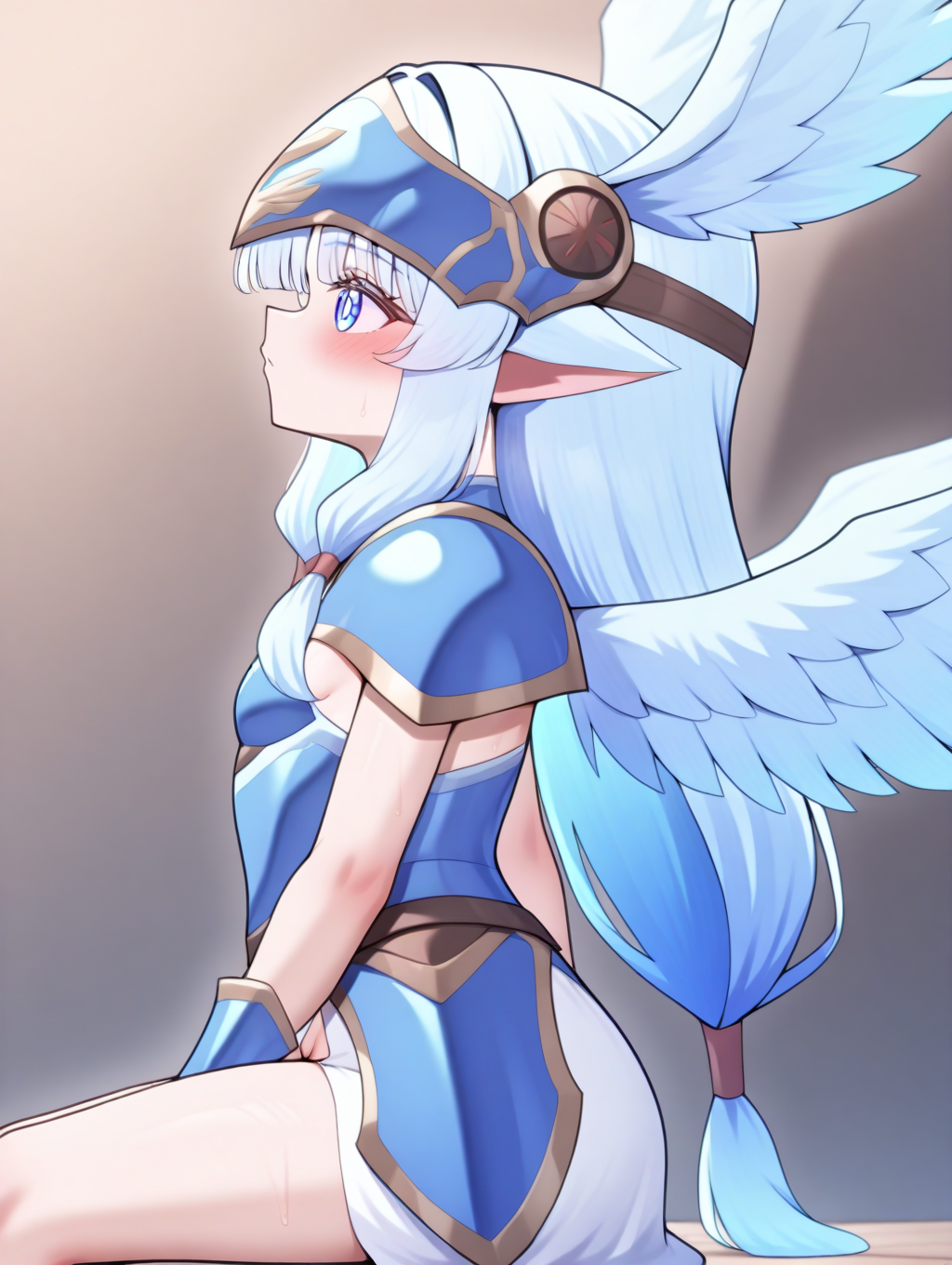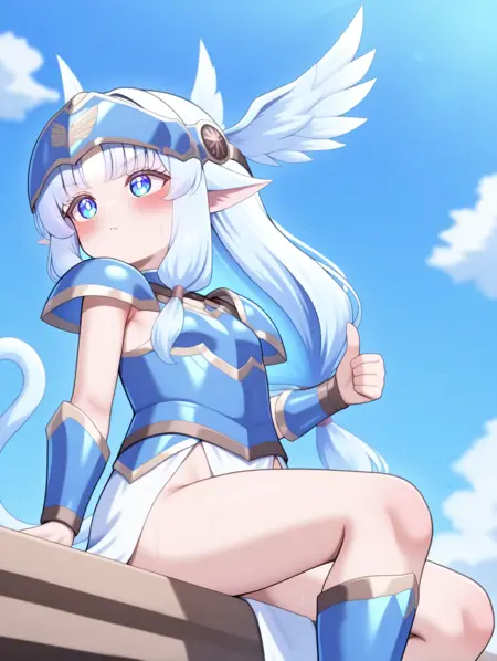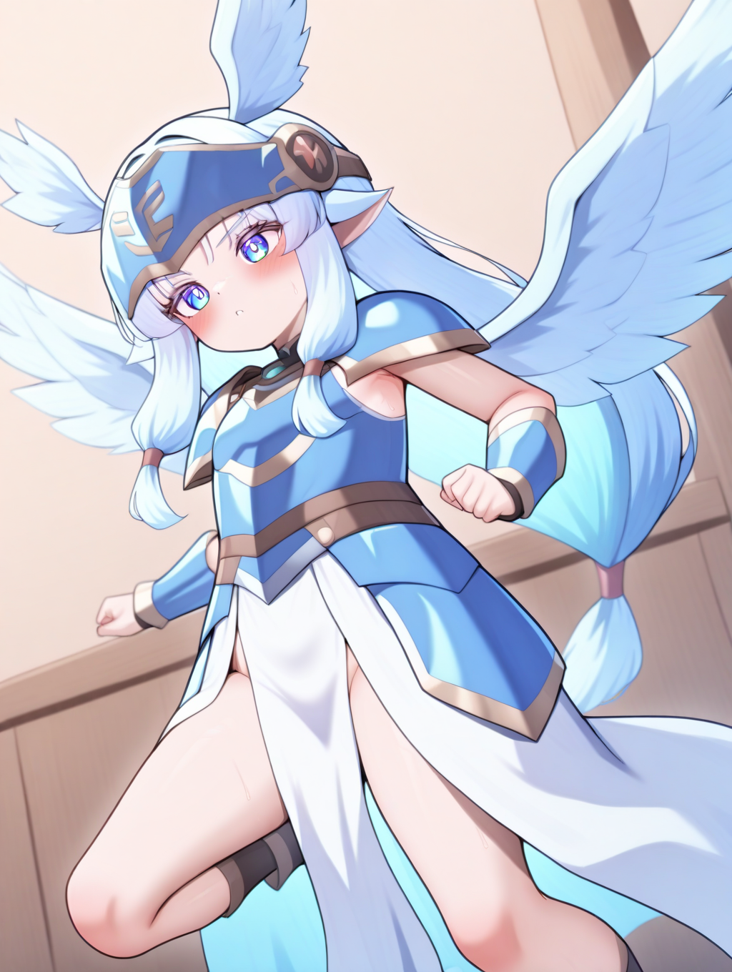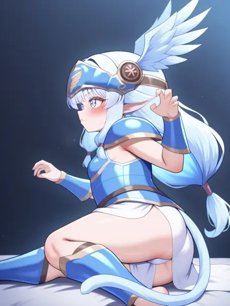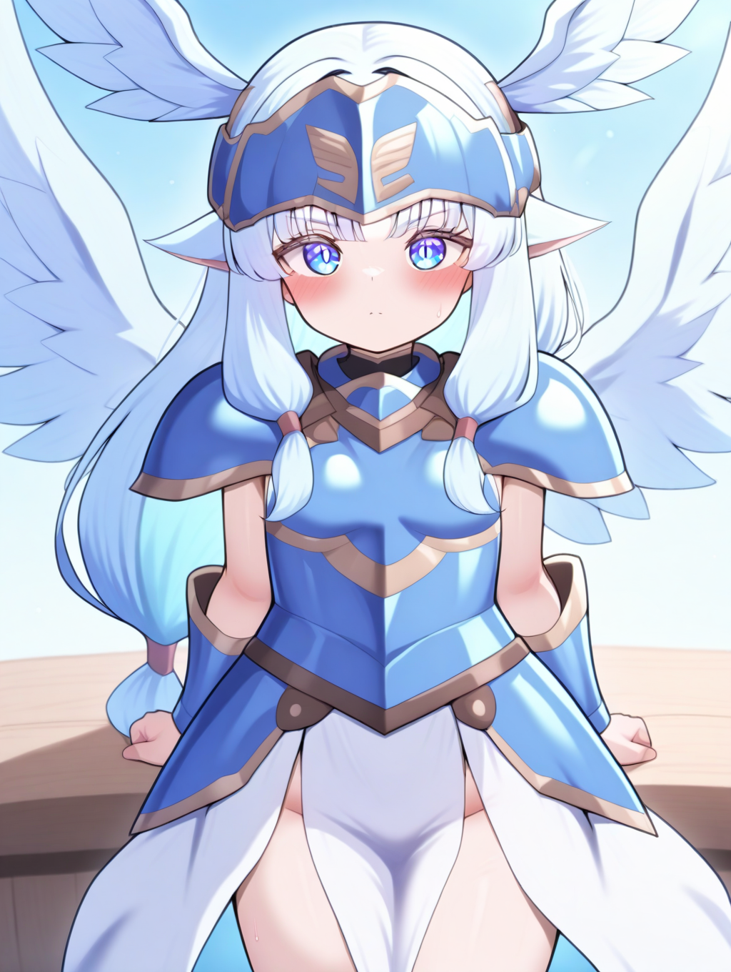 プロンプト例: renasuVA,アニメ色付け,青い目,青い髪,バルキリー,青い鎧のドレス,頭飾り,翼,前面スリット,動物の耳,低く結んだ長い髪,耳が露出,