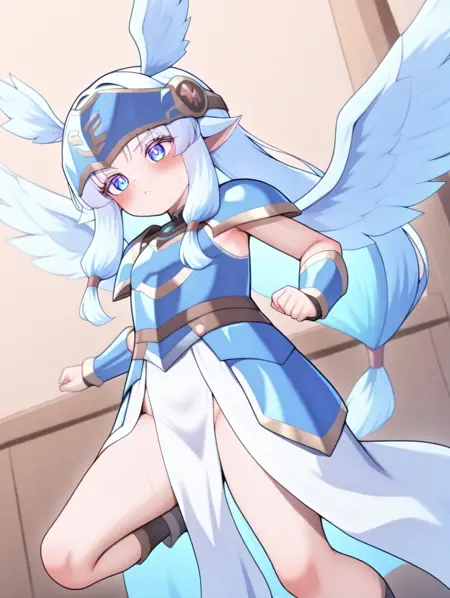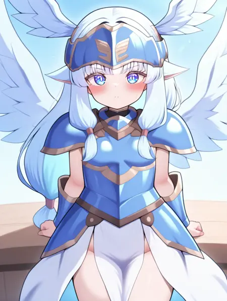 prompt example :renasuVA,anime coloring,blue eyes,blue hair,valkyrie,blue armored dress,headgear,wings,front slit,animal ears,low-tied long hair,bare ears,