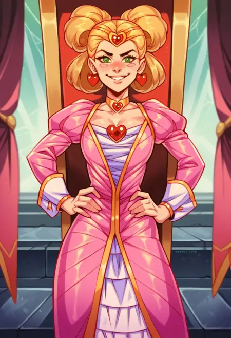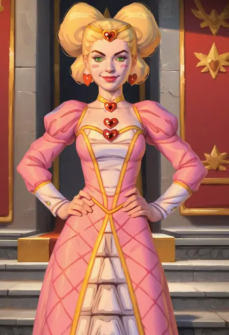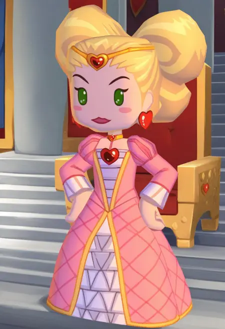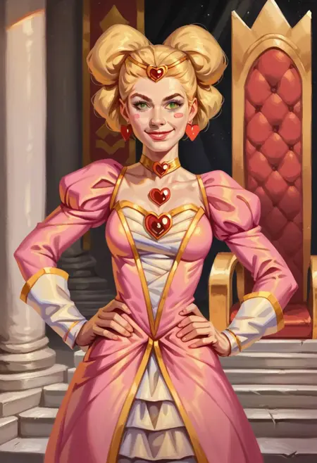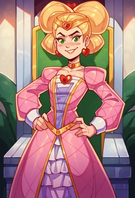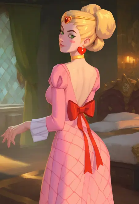 태그: "Duchess_B_MSK, 금발, 녹색 눈, 뺨 스티커"; 옷: "골드 카이커, 분홍 드레스, 하트 귀걸이, 하트 브로치, 금관"; 뒤에서 보일 경우, "하트 브로치"를 "빨강 리본, 금색 머리 뒷단 덮개"로 대체. MySims LoRA의 일반 규칙: 게임 내 스타일에는 "Chibi"를 사용하고, 긍정 프롬프트에 "adult"를, 부정 프롬프트에 "child"를 추가하면 더 자연스럽게 보일 수 있다.