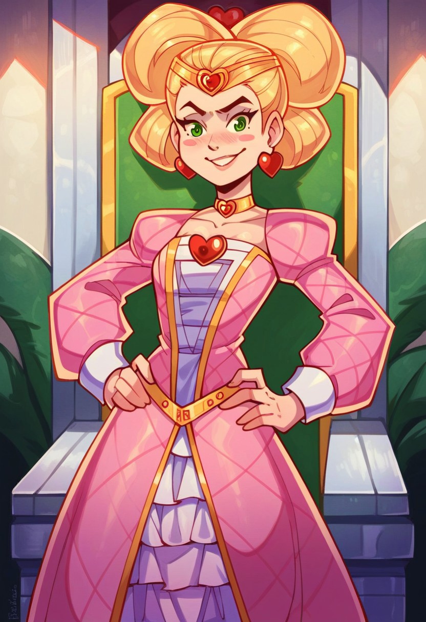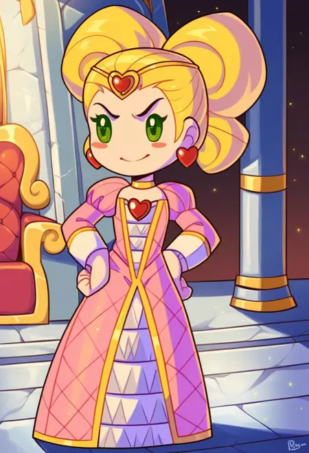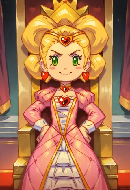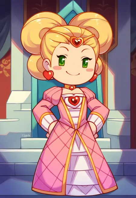 标签为:“Duchess_B_MSK,金发,绿眼,腮红贴纸”;服装为:“金色项圈,粉色连衣裙,心形耳环,心形胸针,金色头环”;若从背后观察,则将“心形胸针”替换为“红色蝴蝶结,金色发髻笼”。MySims lora的常规规则:使用“Chibi”表示游戏内风格,正向提示中添加“adult”,负向提示中添加“child”可能有助于效果更准确。