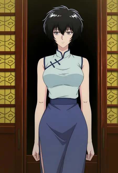 - Reiko Kujirai、灰色の目、黒髪、目の下のほくろ、短髪、ノースリーブ、中国風の衣装、ノースリーブシャツ、青シャツ、青スカート、