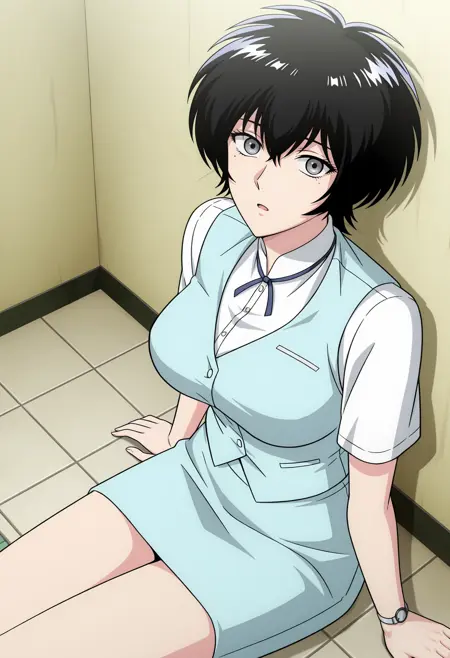 - Reiko Kujirai、灰色の目、黒髪、目の下のほくろ、短髪、薄い青のベスト、薄い青のスカート、白シャツ、ペンシルスカート、