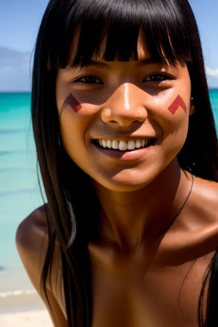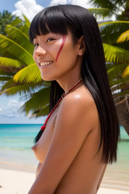 Prompts that can improve your results: red_forehead_paint, nipples, large_breasts, medium_breasts, small_breasts, long_tribal_necklace, blunt_bangs, straw_g-string, tattoo...
