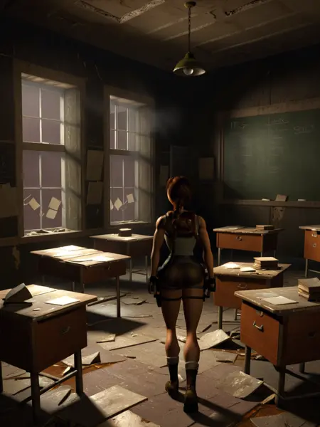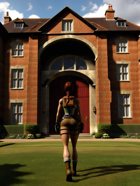 트리거 단어: _TR3D, 라라 크로프트, 3D 렌더링, 등 돌림, 등을 향함