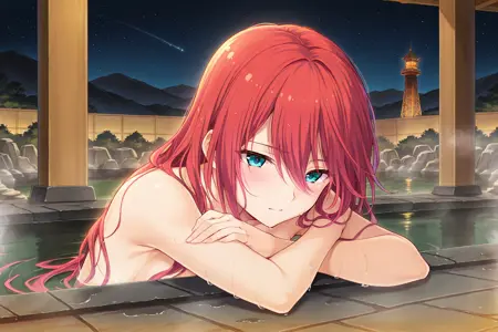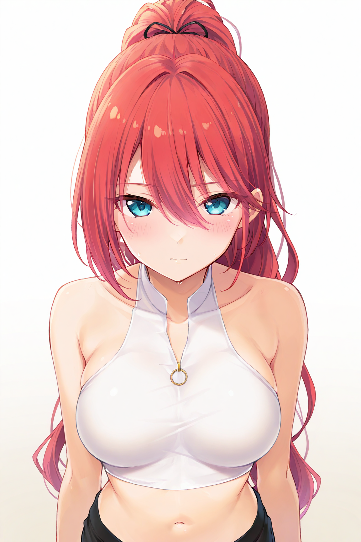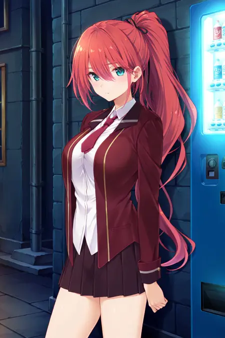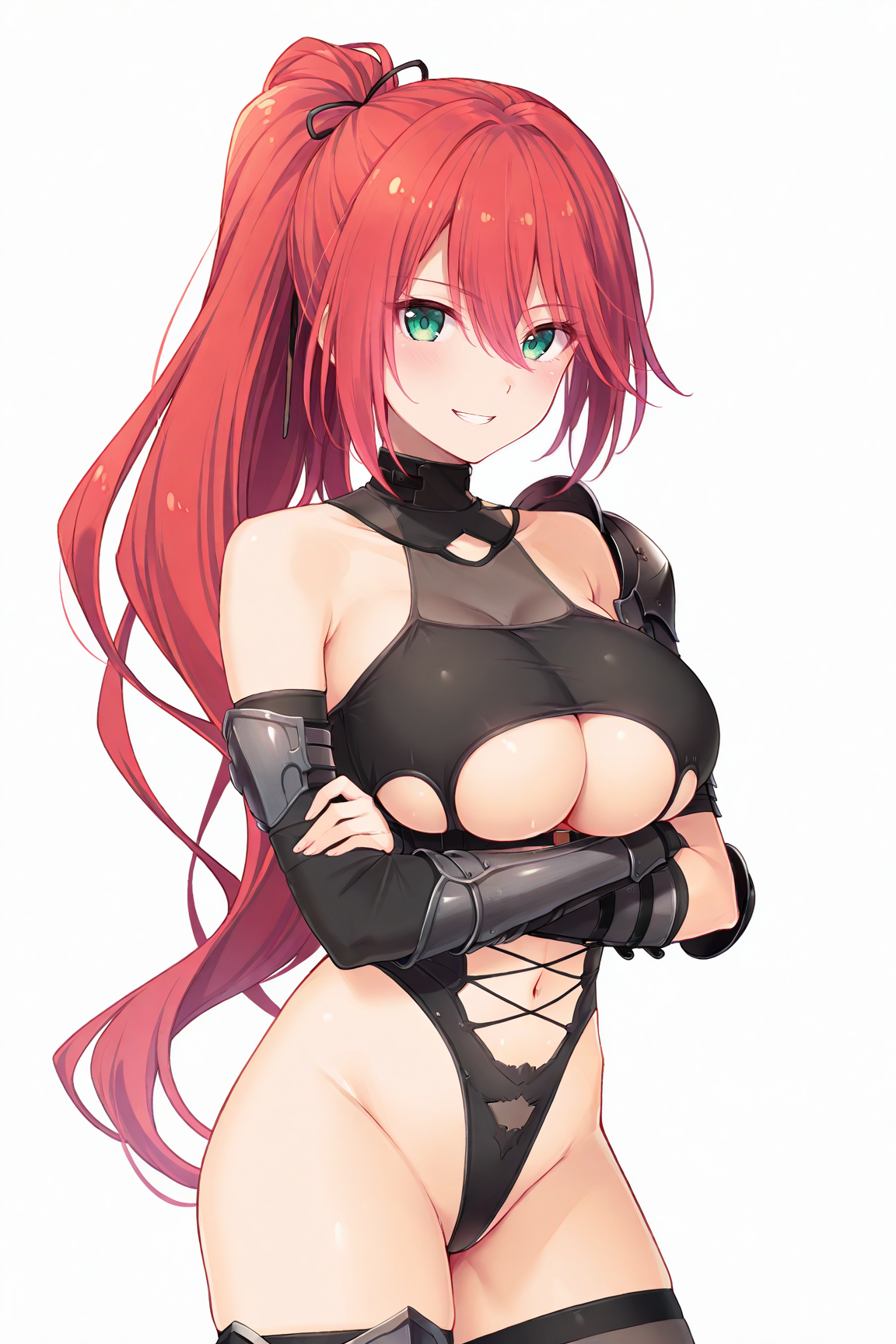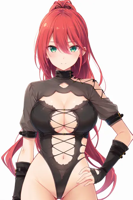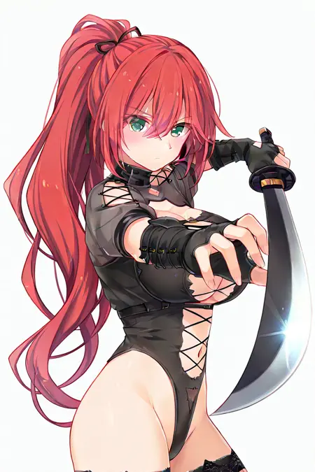 KizukiRei, green eyes, red hair, long hair, high ponytail, hair between eyes, hair ribbon, black ribbon,