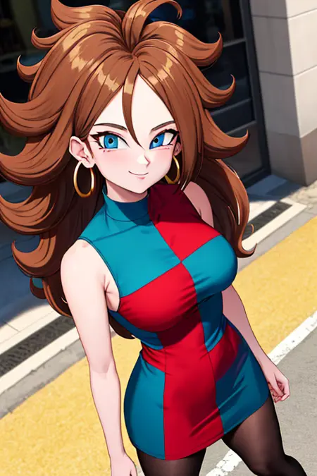 masterpiece, best quality, highres, aaandro, brown hair, long hair, curly hair, blue eyes, hoop earrings, two-tone dress, checkered dress, sleeveless, black pantyhose, dragon ball, lora:android_21_v1:0.7, street, cowboy shot, standing, smile, lora:skinny_new_skin:0.2 lora:detailed_eye:0.1 RAW photo, a young woman (high detailed skin:1.2), 8k uhd, dslr, soft lighting, high quality, film grain, Fujifilm XT3