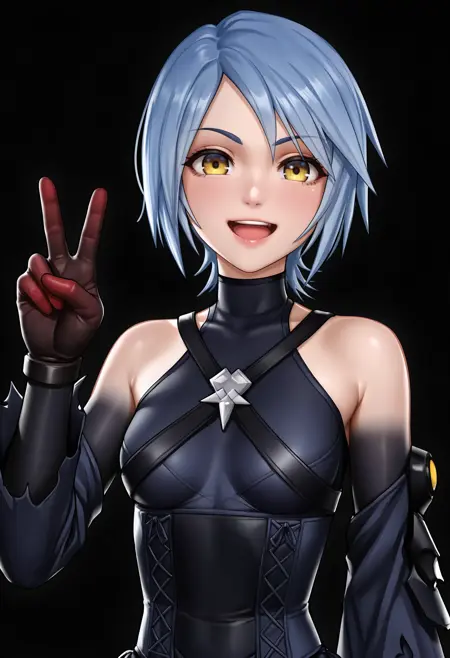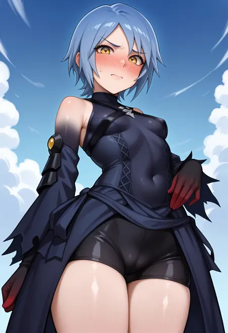 • a4ilf, 1girl, 短髪, 青髪, 黄色い目, ドレス, グローブ, 肩出し, 外側の袖, ティーガール, ヒール, バイクショーツ