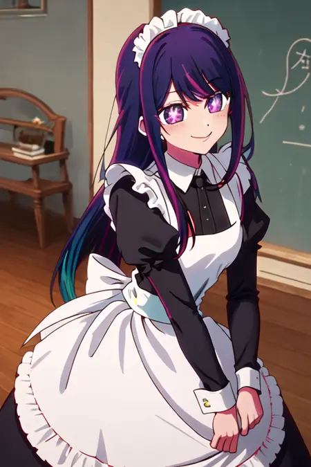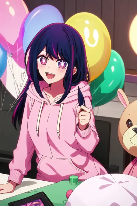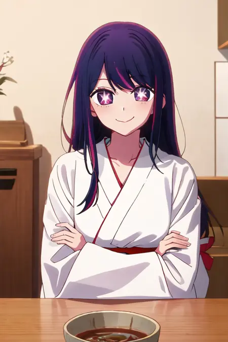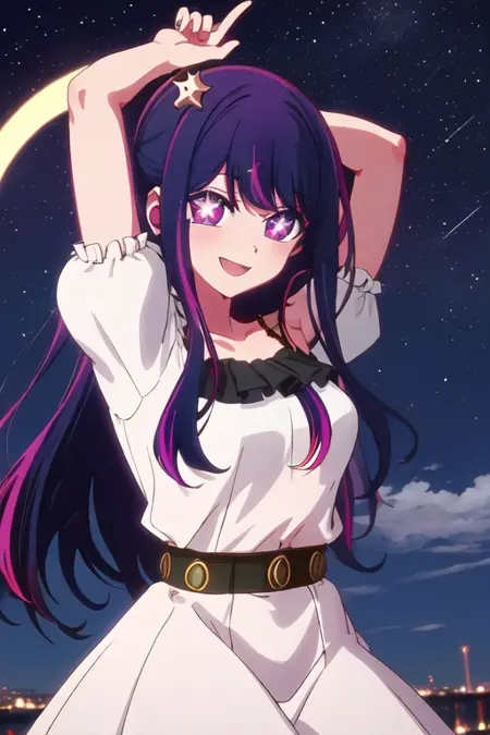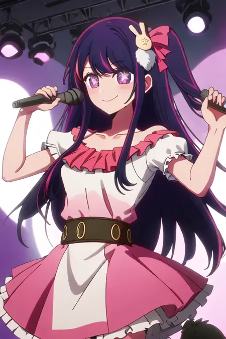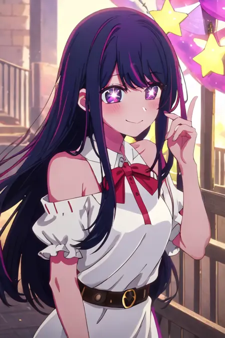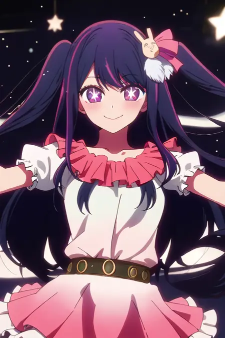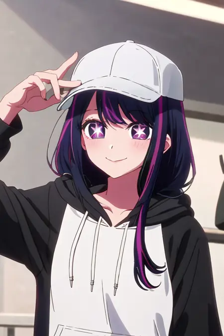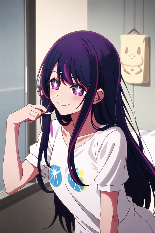 触发词为 hoshino_ai_oshinoko,推荐标签为:best quality, masterpiece, highres, solo, {hoshino_ai_oshinoko:1.15}, long_hair, purple_eyes, purple_hair, bangs, smile, symbol-shaped_pupils, multicolored_hair, star-shaped_pupils。