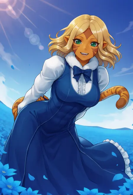 항상 필요: "호랑이 소녀, 주황색 피부, 컬러링된 피부, 뾰족한 귀, 동물 귀, 얼굴 무늬, 녹색 눈, 수직 동공, 금발 머리, 중간 길이 머리, 갈라진 앞머리, 줄무늬 꼬리, 가슴, 근육질의 여자"는 항상 포함해야 합니다. 그녀의 붉은 입술을 위해 "립스틱"을 추가하세요.