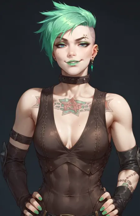次服装,slashqc,露胸,长裤,护肘,手套,undercut,绿发,绿唇