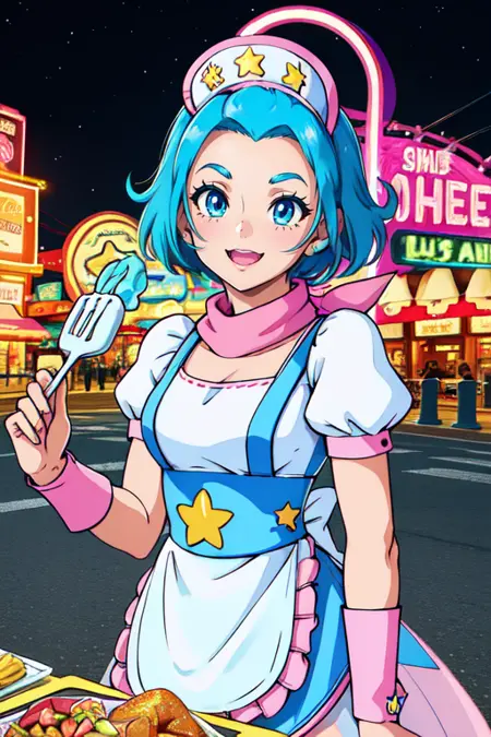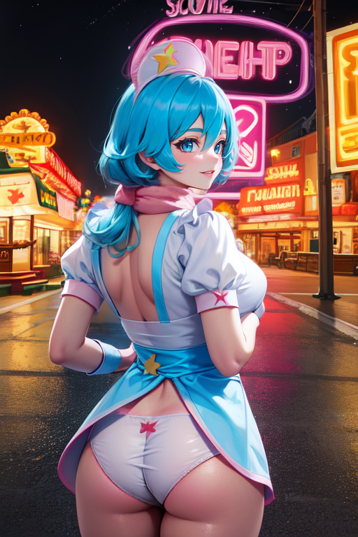 护士帽,白色连衣裙,带星星图案(符号)的蓝色女仆围裙,白色内衣,蓬松袖子,粉色围巾,滚轴滑冰鞋,