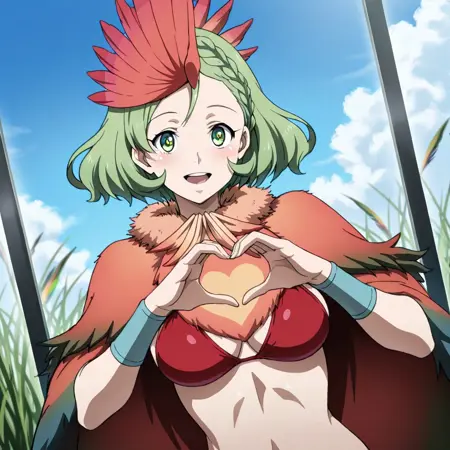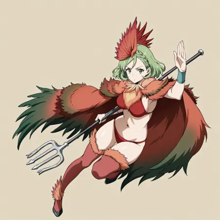 녹색 눈, 녹색 머리카락, 땋은 머리, 짧은 머리, 중간 크기의 가슴, 머리 장식, 모피 목렬, 하트, 깃털로 만든 망토, 다색 망토, 깃털, 가상의 날개, 팔찌, 허리 부분, 빨간 비키니, 깃털 허벅지 양말